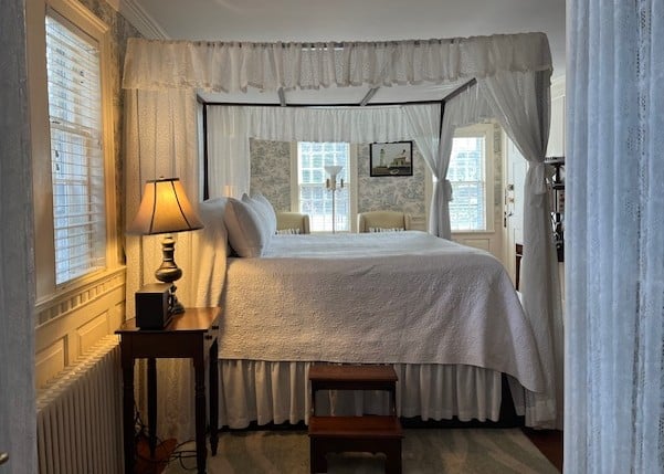 The Hideaway Suite is on the second floor of our Captain’s Cottage, in what was once the attic space. The bedroom features a queen-size bed, while the sitting area has a sofa and wing-back reading chairs and a Smart TV. Includes a private full bathroom. The guest room also has a gas fireplace, air conditioning, a refrigerator, and a coffee maker. We do not recommend the Hideaway Suite for women who are pregnant or anyone who is elderly or has a bad knee, etc. The stairs leading up to the room are rather steep and some of the ceilings are low. Other than that, it is a charming, bright room and a favorite among those who appreciate the charm of an older home. 511 square feet.