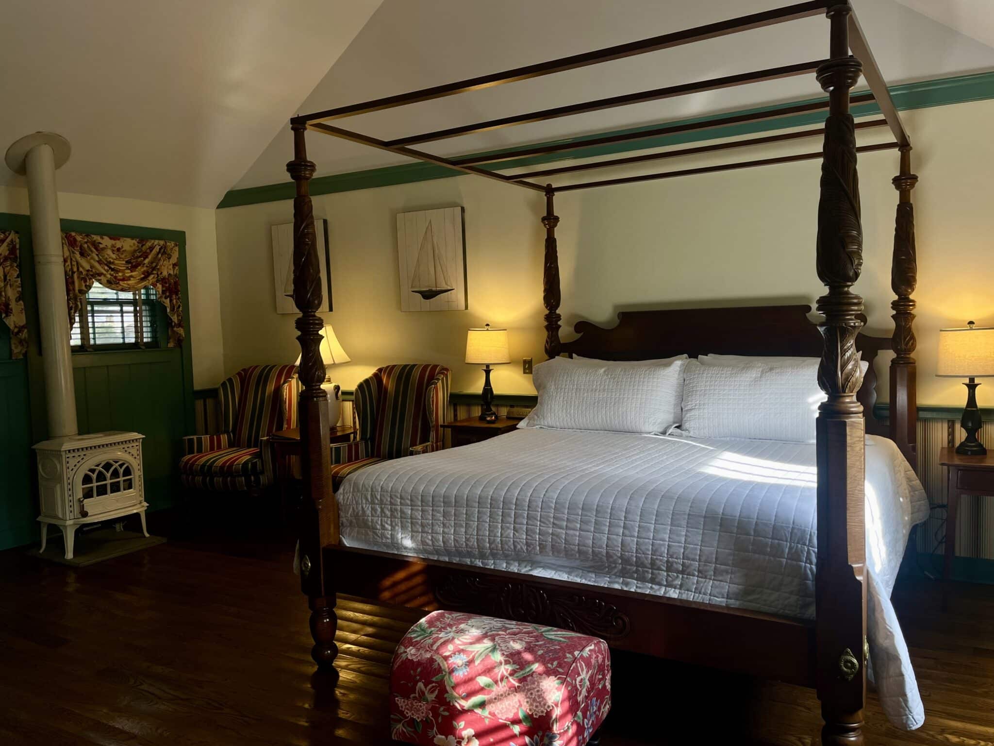 Tradewinds is a spacious room on the first floor of the Carriage House with a king-size bed, two wing-back reading chairs, a Smart TV, and a potbelly gas stove fireplace. Nestled in an alcove, you will find a double soaking tub, while the room also features a separate private bathroom. Other amenities include a refrigerator, coffee maker, and air conditioning. 478 square feet.
