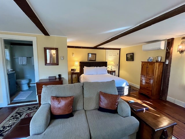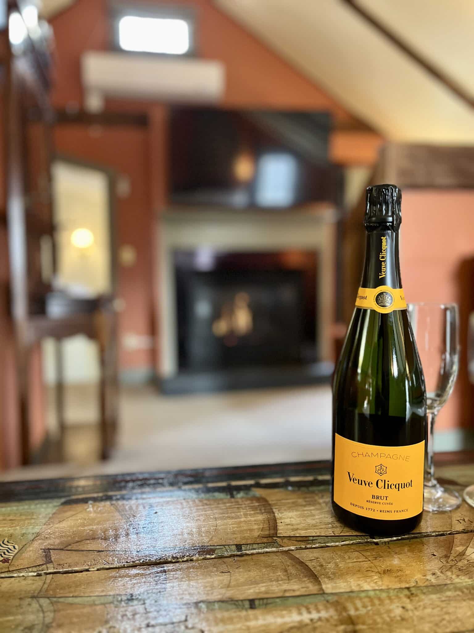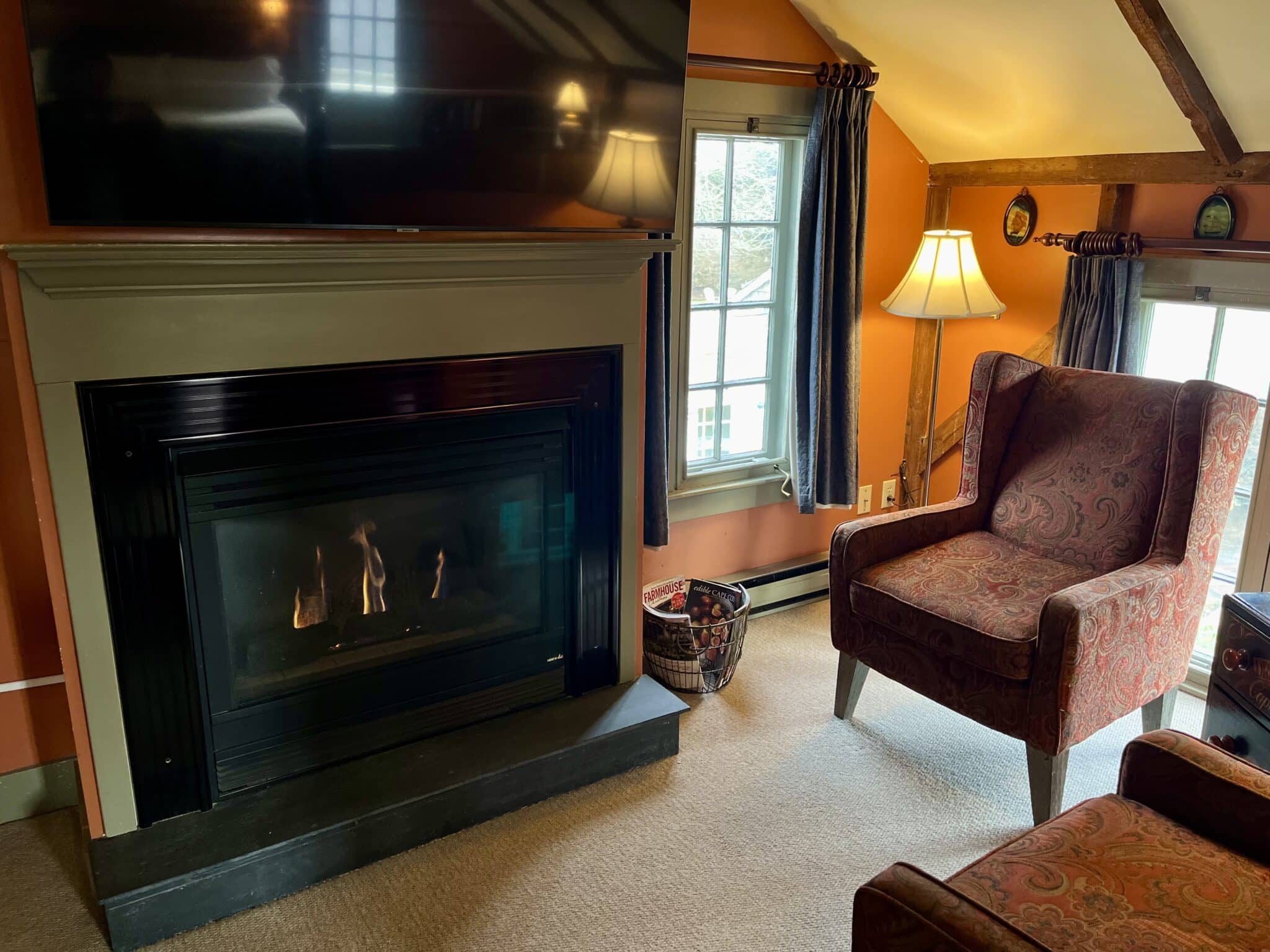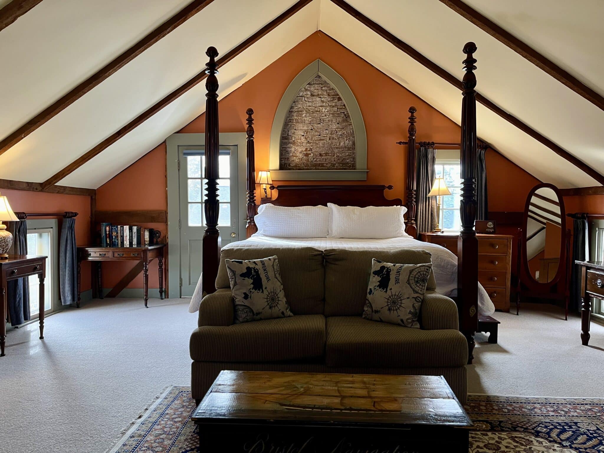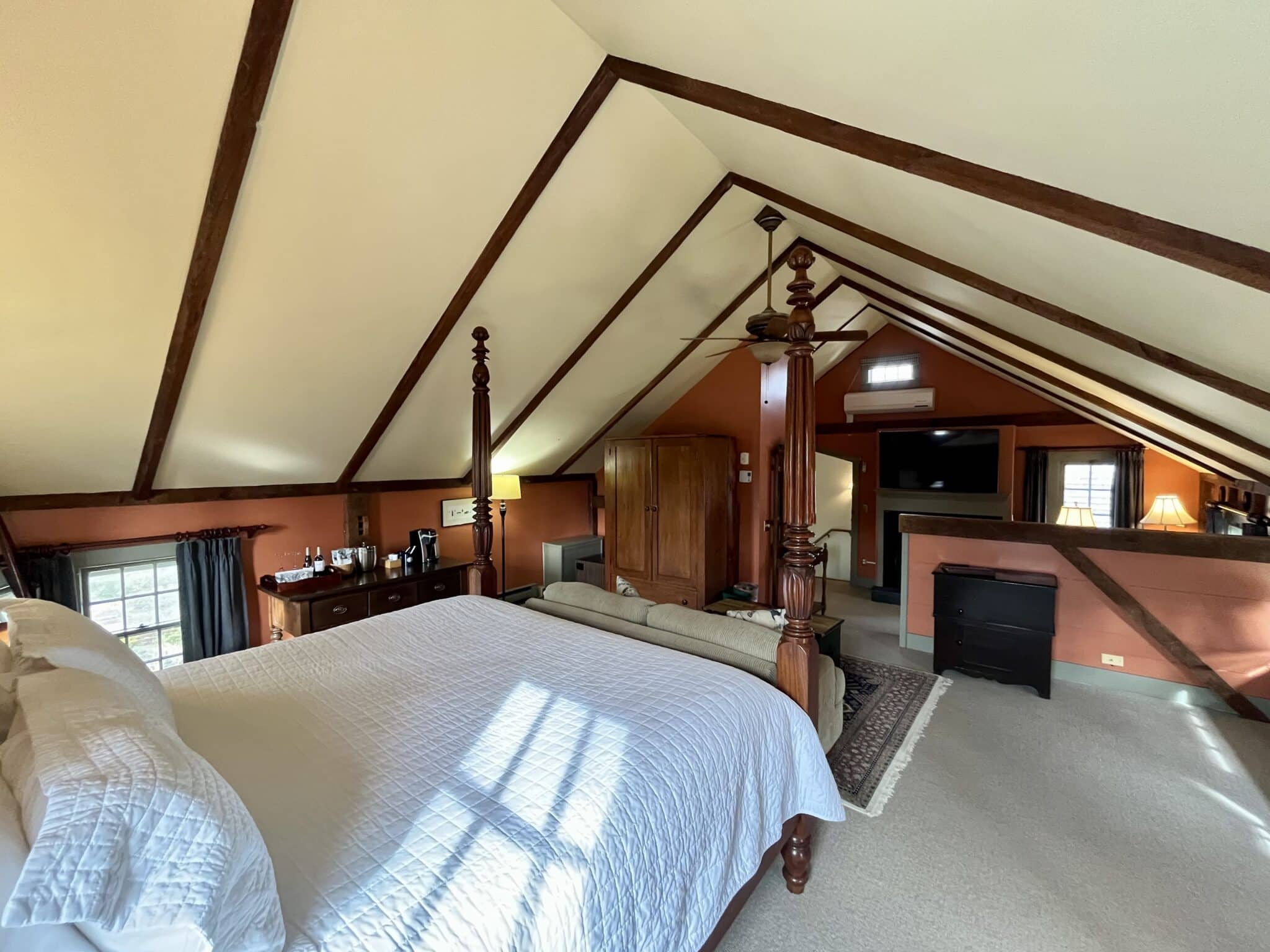 Located on the second floor of the Carriage House, the Wild Pigeon is a spacious room with a king-size bed and a sunken sitting area that has a gas fireplace and two wing-back reading chairs. The room features beamed cathedral ceilings, as well as a private bathroom with a walk-in shower. Amenities include a Smart TV, refrigerator, coffee maker, and air conditioning. 481 square feet.
