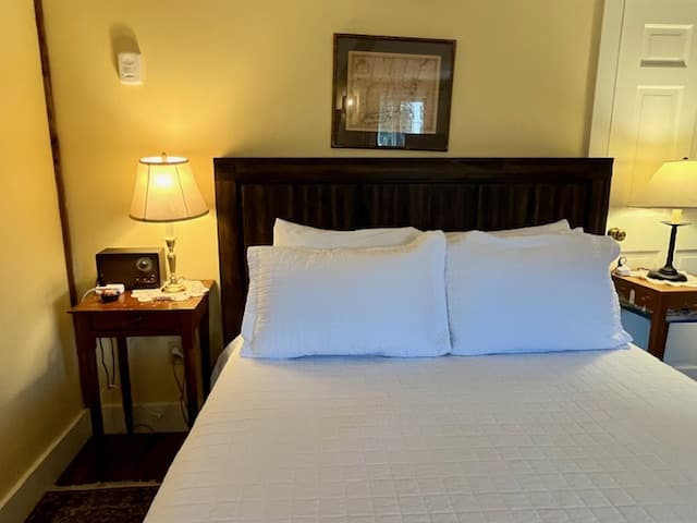 The Intrepid Room, located on the first floor of the Carriage House, has a queen-size bed, two wing-back reading chairs, refrigerator, and a SmartTV, perfect for some rest and relaxation. The private bathroom offers a tubbed shower. This guest room also features a gas fireplace and air conditioning. 294 square feet.