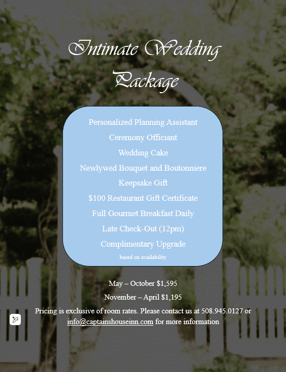 Bed and breakfasts make for a whimsical wedding location and with our lovely historic sea captain inn, we hope to make your dreams come to life. Our beautiful two-acre property is the perfect setting for an intimate elopement or wedding, and our experienced staff will make sure every detail is thought of so that you can focus on enjoying your special day. Our package is designed for a smaller, intimate wedding, with a maximum of 20 people, including the bride and groom.